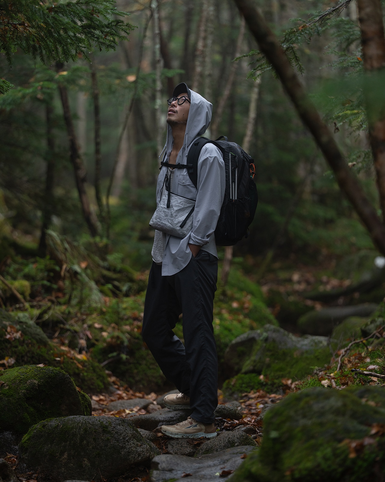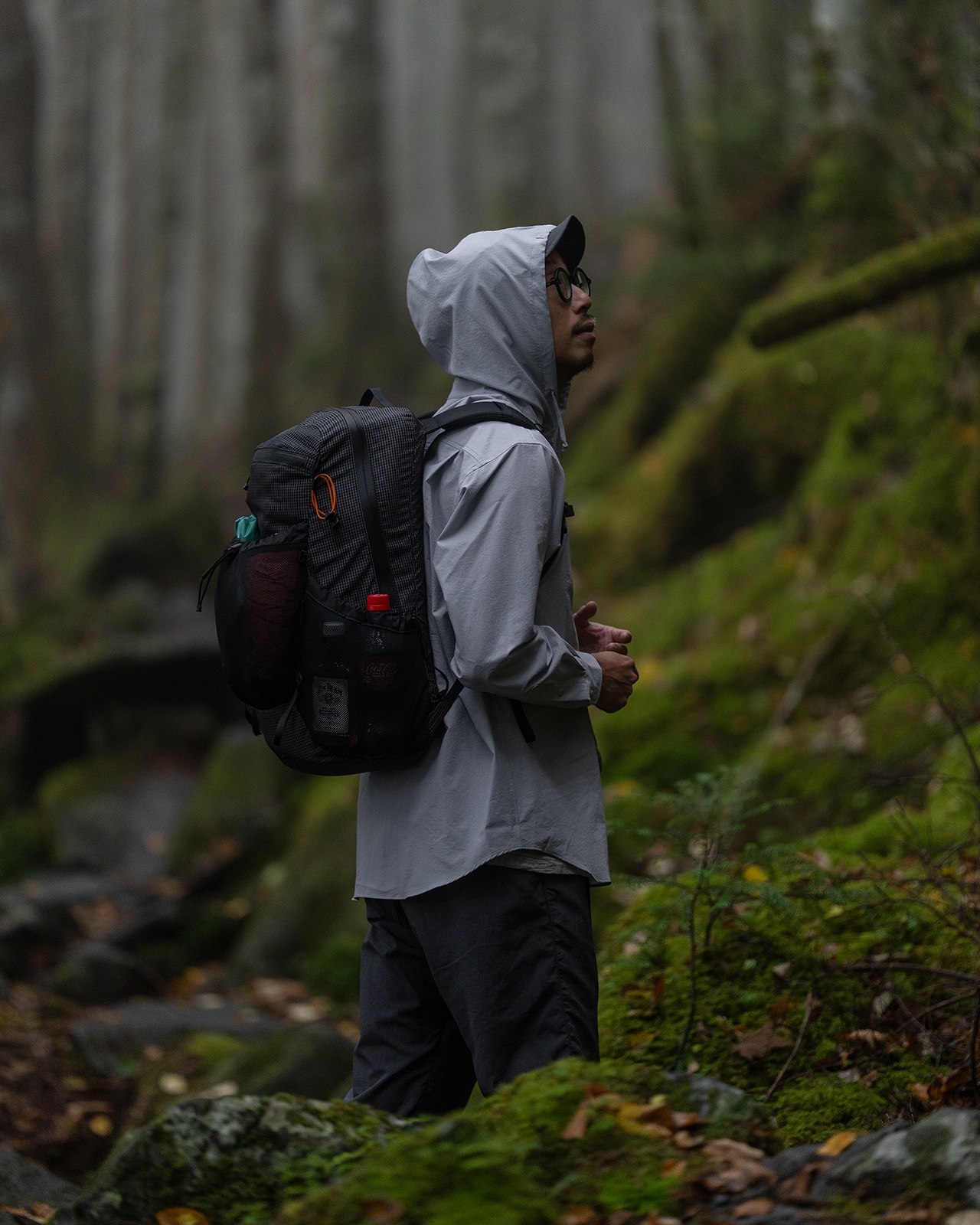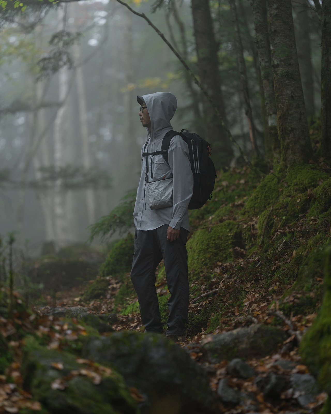 通気性が高く歩いていても熱がこもりにくい。湿った樹林帯の中でも快適さを保ってくれる。さらに高い撥水性もあるから、頭上から落ちてくる小さな雫は生地の表面で弾いて転がり落ちていく。軽い霧雨くらいなら気にせず歩けるのが安心。