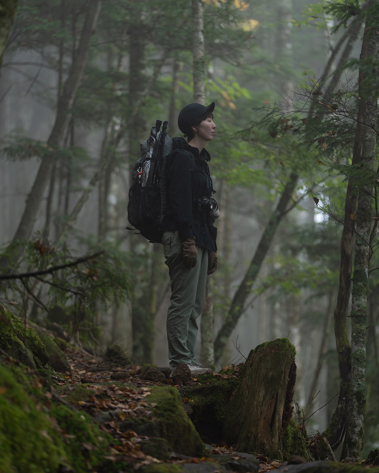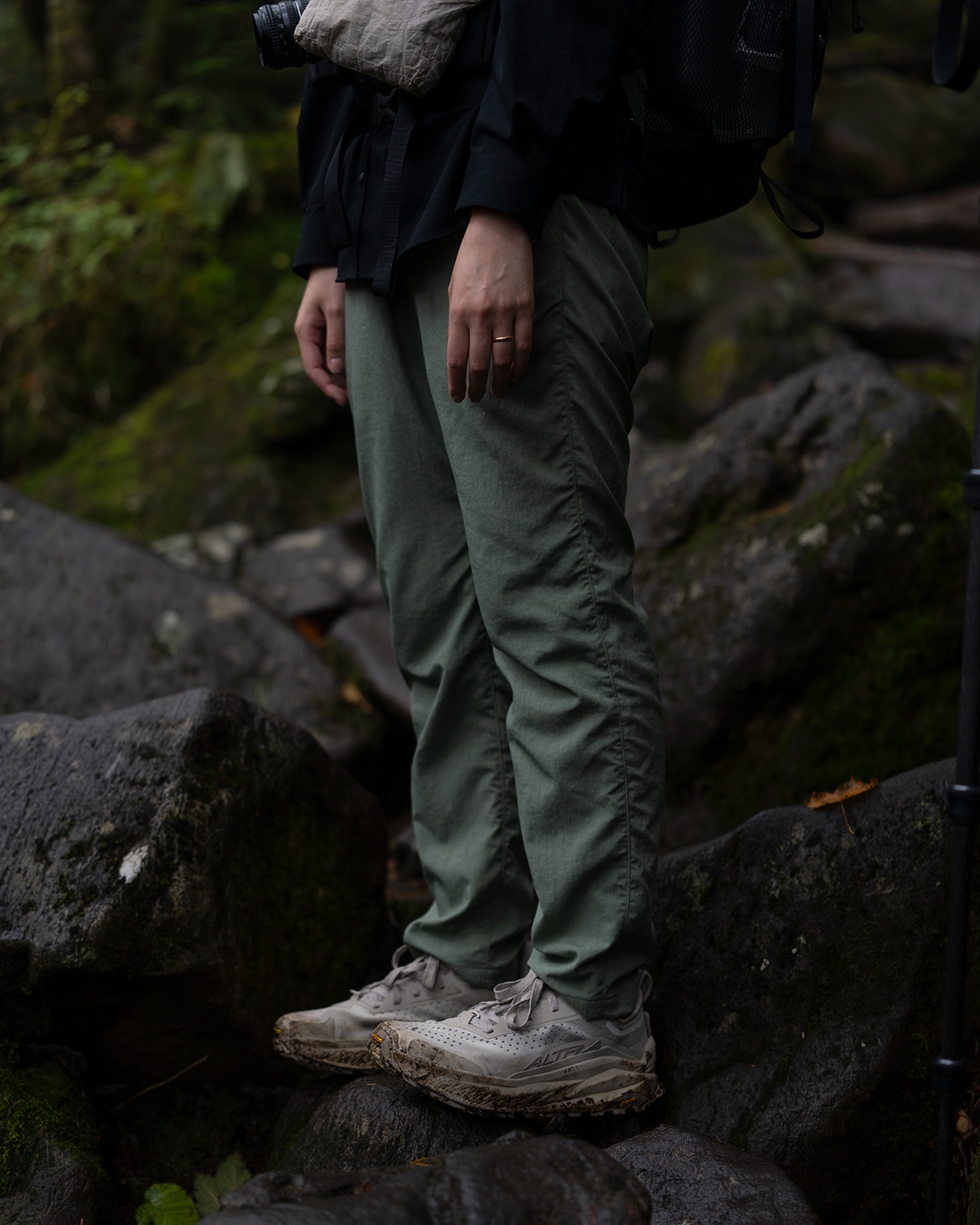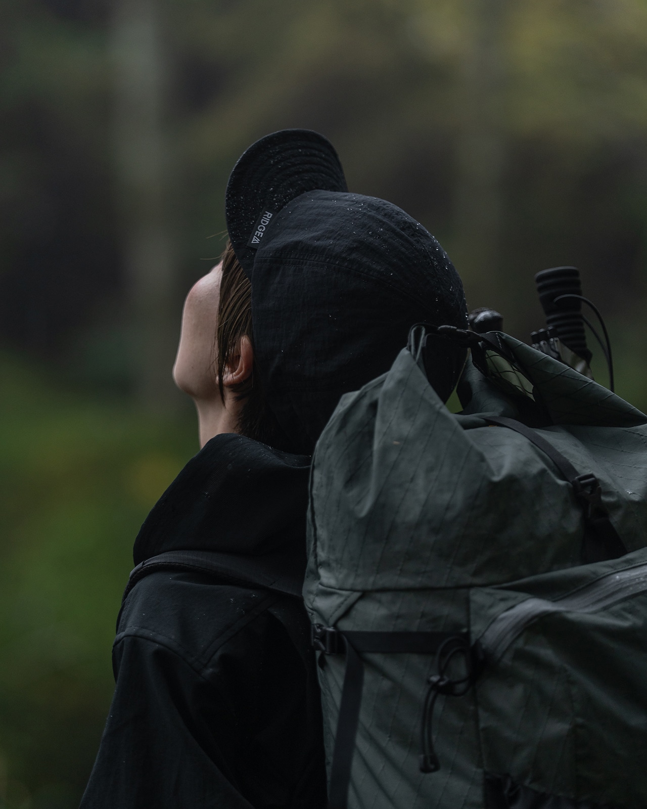通気性が高く歩いていても熱がこもりにくい。湿った樹林帯の中でも快適さを保ってくれる。さらに高い撥水性もあるから、頭上から落ちてくる小さな雫は生地の表面で弾いて転がり落ちていく。軽い霧雨くらいなら気にせず歩けるのが安心。