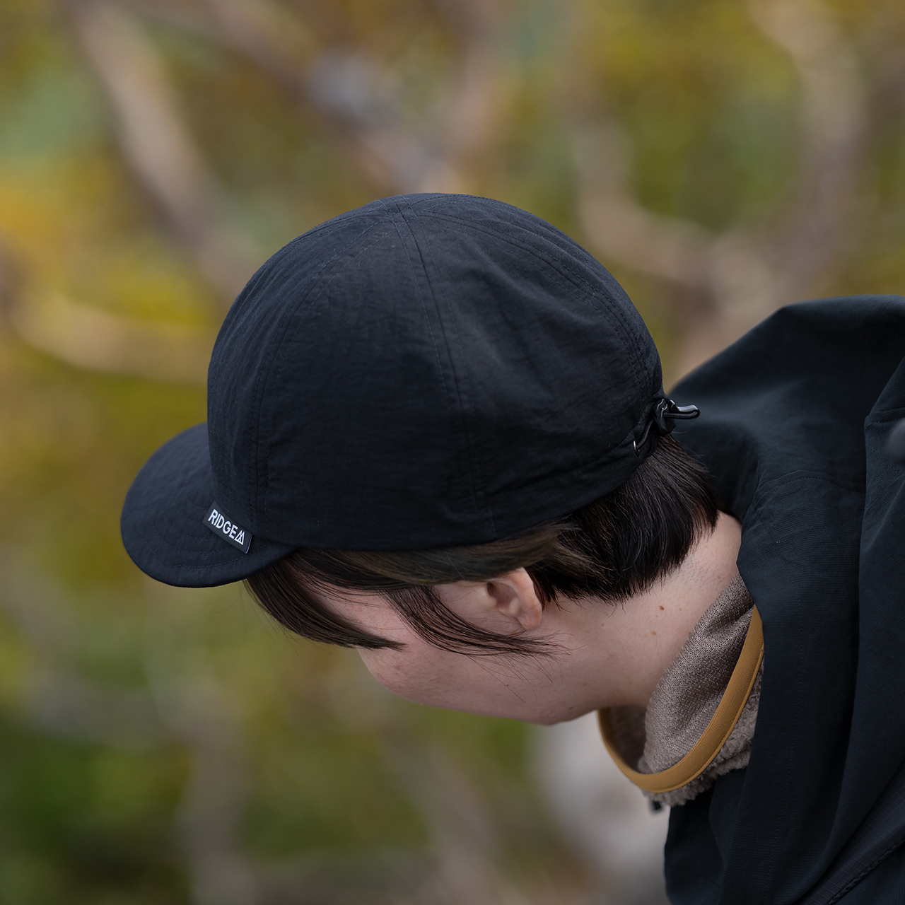 後部にあるプラスチックタブを引っ張ることでゴムを引き締め、簡単にサイズを調整できます。この調整機能により、着用時のフィット感が向上し、風が強い環境でも安定した装着感を実現します。特に山頂や稜線など、強風が予想されるアウトドアシーンでその効果を発揮します。