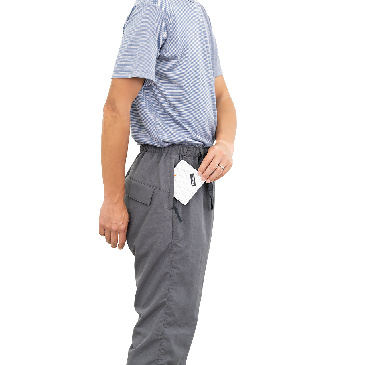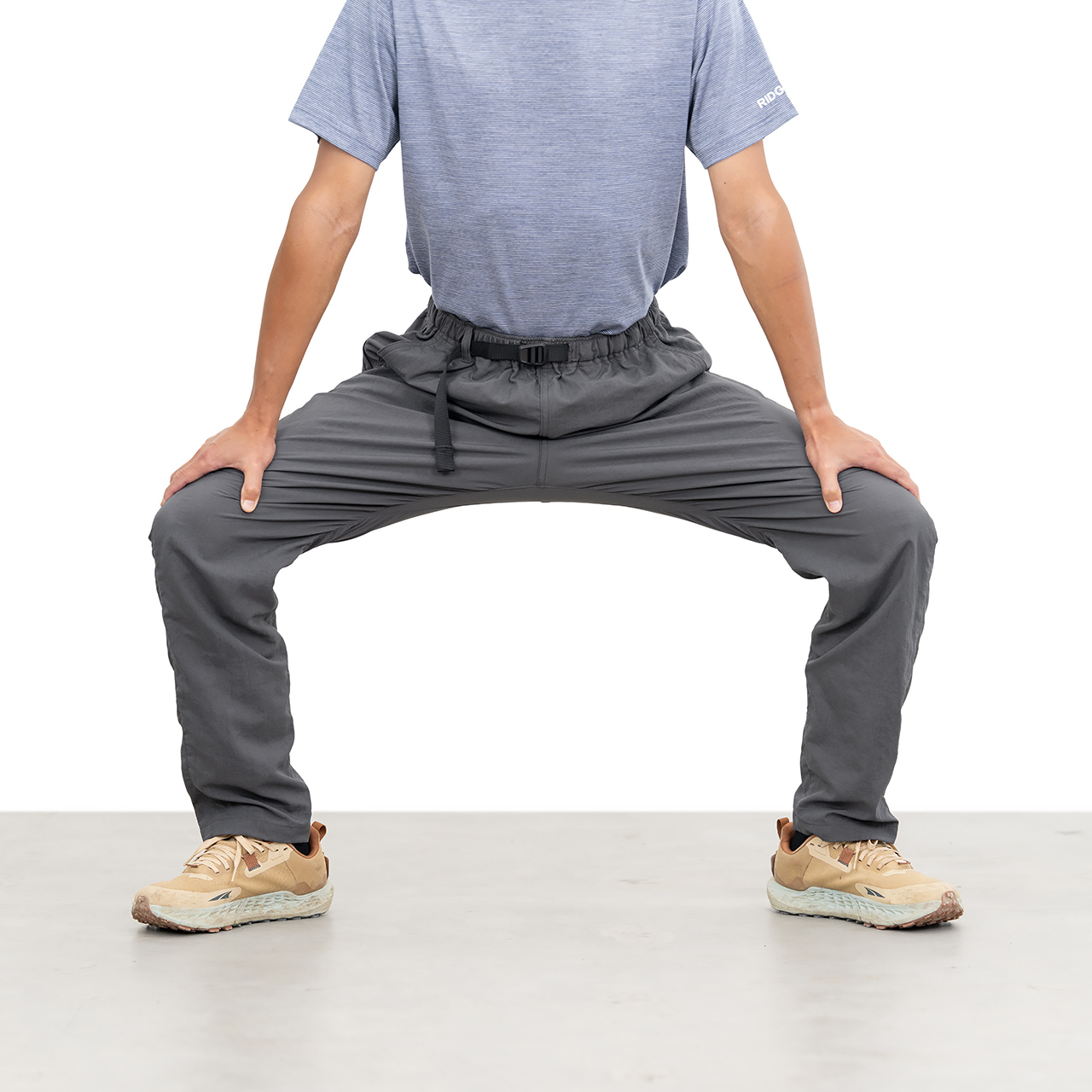 だからRIDGE MOUNTAIN GEARのシグネチャーパンツとも言えるこのBasic Hike Pants では、伸びに頼るのではなく、パターン設計で動きやすさをつくる方向を選びました。生地はノンストレッチですが、ヒップから膝、裾にかけて必要なゆとりを的確に配置し、歩く・しゃがむ・またぐといった動作に対して無理が出ないようにしています。その結果、動きやすさを損なわず、穿いたときの輪郭が長く安定する一本に仕上がりました。