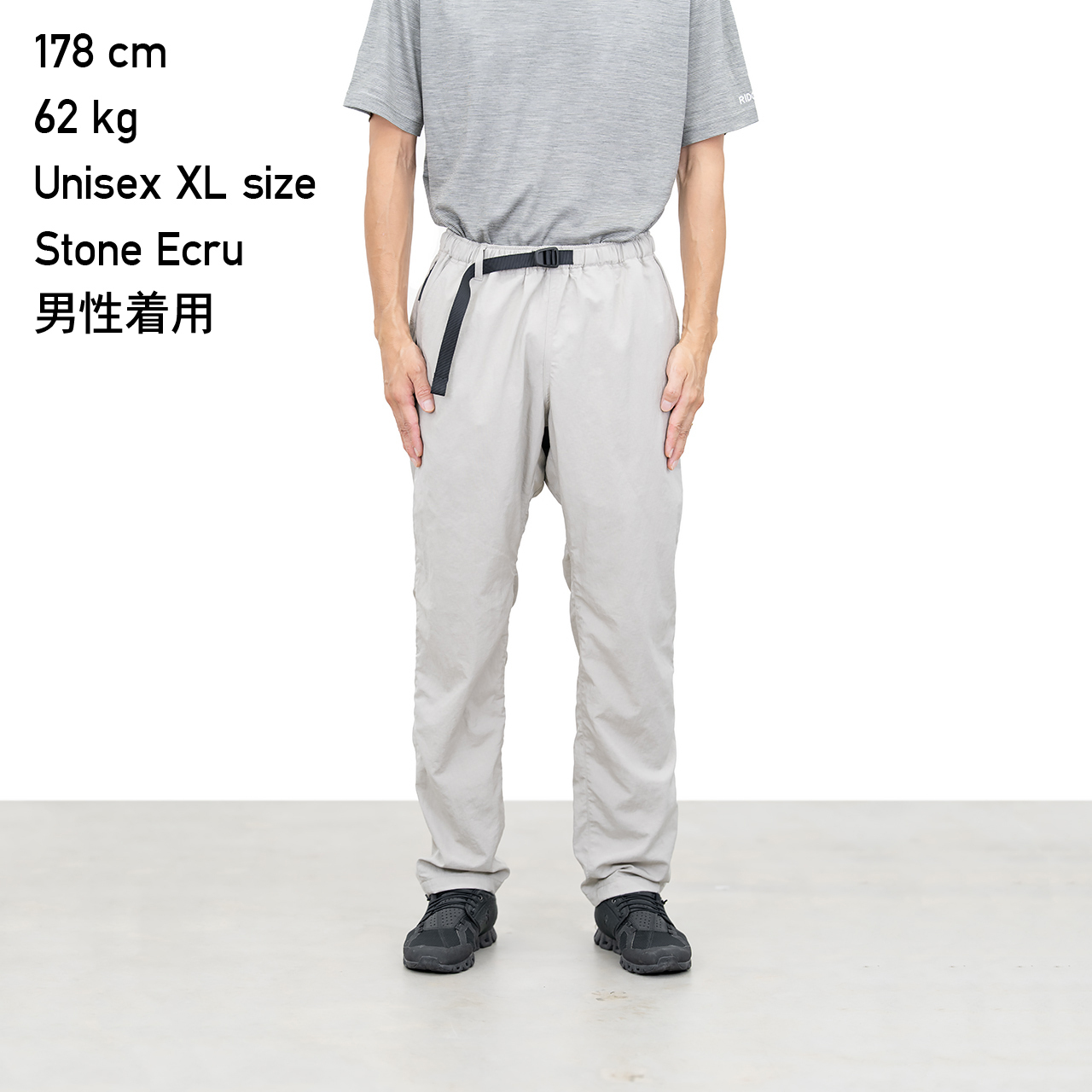 ウエストはゴム仕様で、穿いた瞬間から力が抜けるラクさがあります。とはいえ、ただ楽なだけのパンツにはしたくなくて。腰まわりの収まり、股上のバランス、腿から裾へ落ちるラインまで、全体がスッキリ見えることにこだわりました。ベルトを締めなくても整う。シャツをタックインしても崩れない。動きやすいのに姿勢がよく見える。そういう佇まいを目指しました。