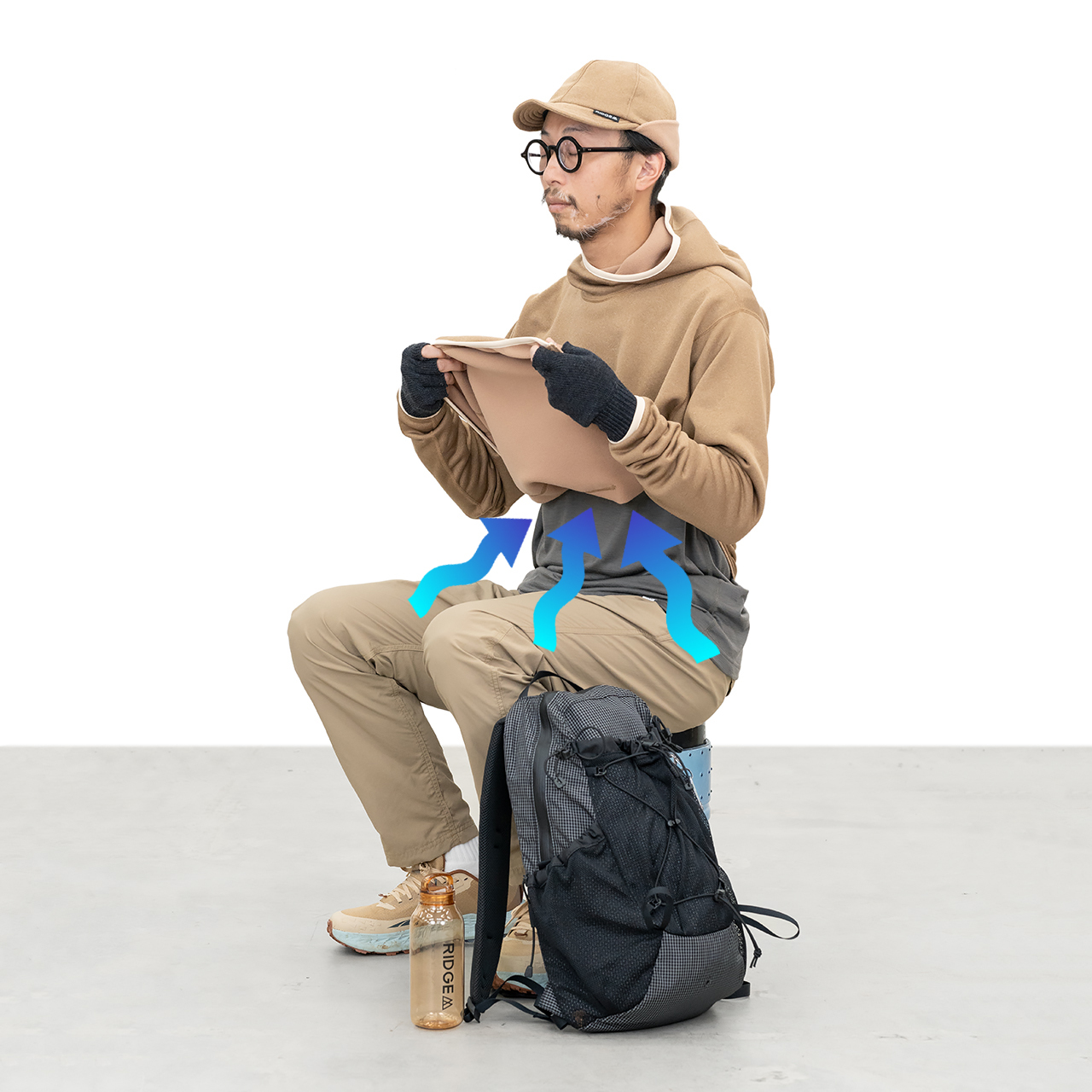 このファスナーは脱ぎ着をしやすくする。という意味もありますが下記画像のような排熱の役割もあります。