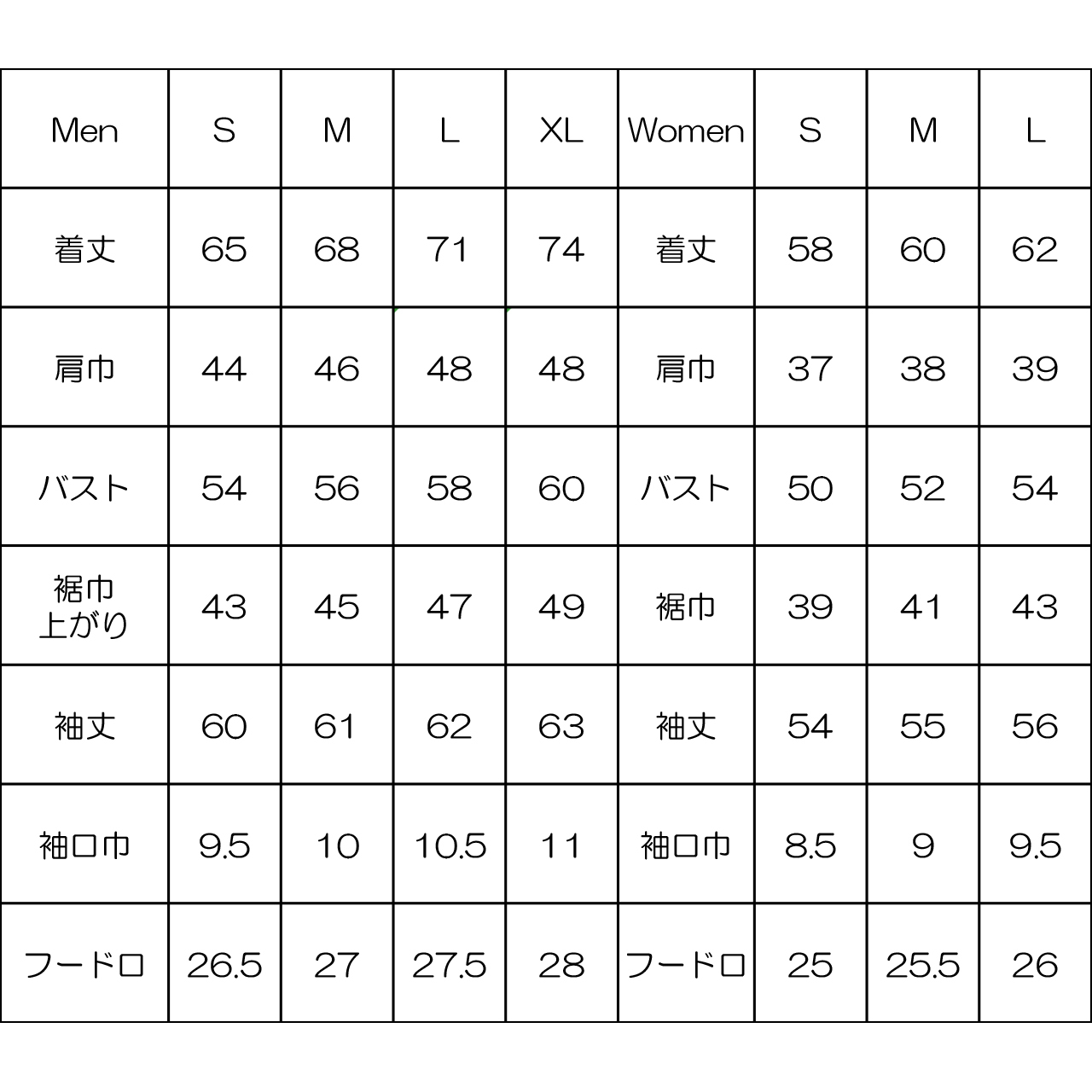 全体的なシルエットは男性用サイズ(Men)と女性用サイズ(Women)共に大きな違いはありませんが、女性用サイズ(Women)は着丈、肩幅など、より女性の体型に合わせたシルエットとなっています。