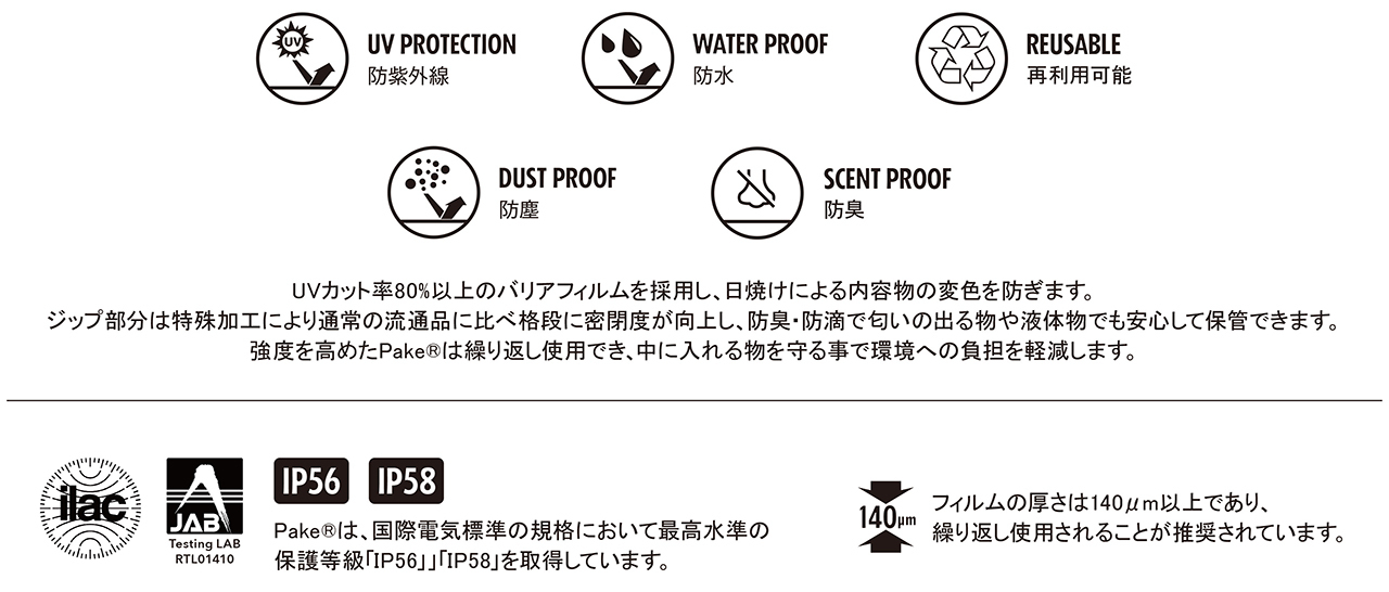 強度にも配慮されており、繰り返し使えるのもPake®︎の魅力のひとつ。使い捨てではなく、日々の持ち運びや整理のための“道具”として付き合っていける存在です。国際電気標準の保護等級としてIP56 / IP58を取得している点も、このプロダクトの信頼感につながっています。