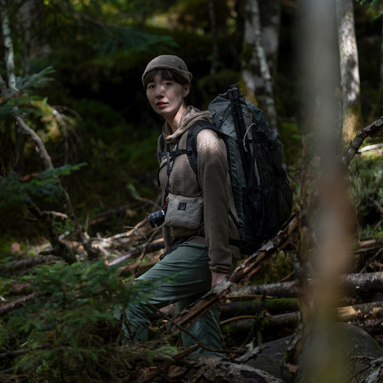 樹林帯を抜ける手前、Enough Shell Jacketのフロントジップを少し下げるだけで、こもった熱がするすると抜ける。背中にザックが乗っていても肌離れは軽く、ベタつかない。稜線に上がり、風を受けて立ち止まると、抱えていた空気が ふわっと 温かさに変わる。ここでEnough Shell Jacketの出番。Pertex® Equilibriumを用いた薄手のシェルが、必要な守りだけを薄く足す。Seionがつくる「抜け」をそのまま生かしながら、風やにわか雨への境界線を引く。それがEnough Shell Jacketの役割。