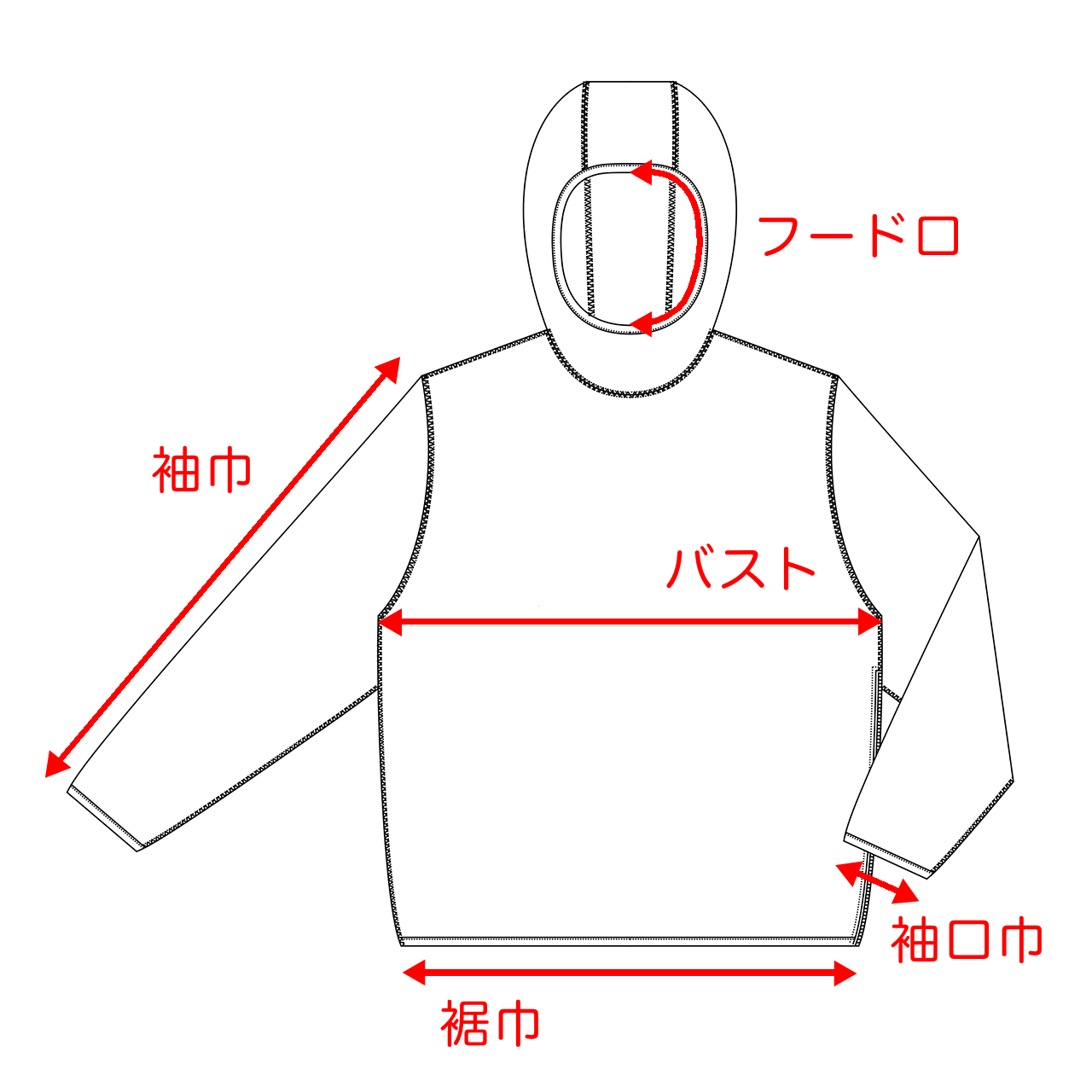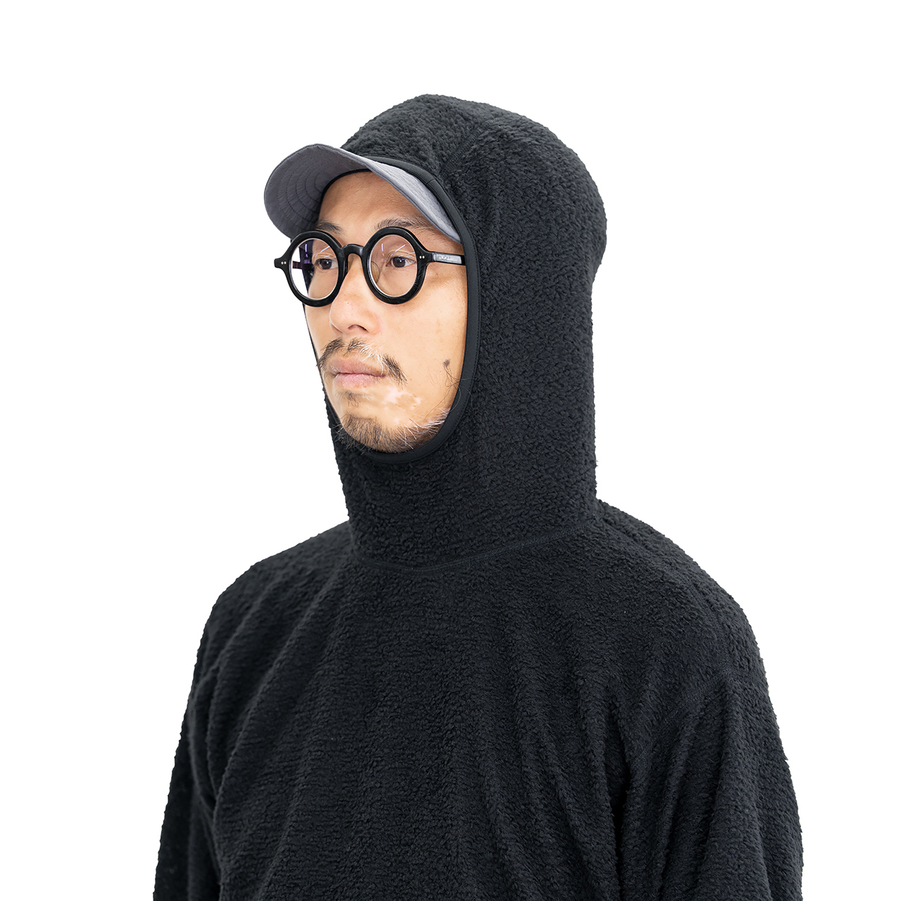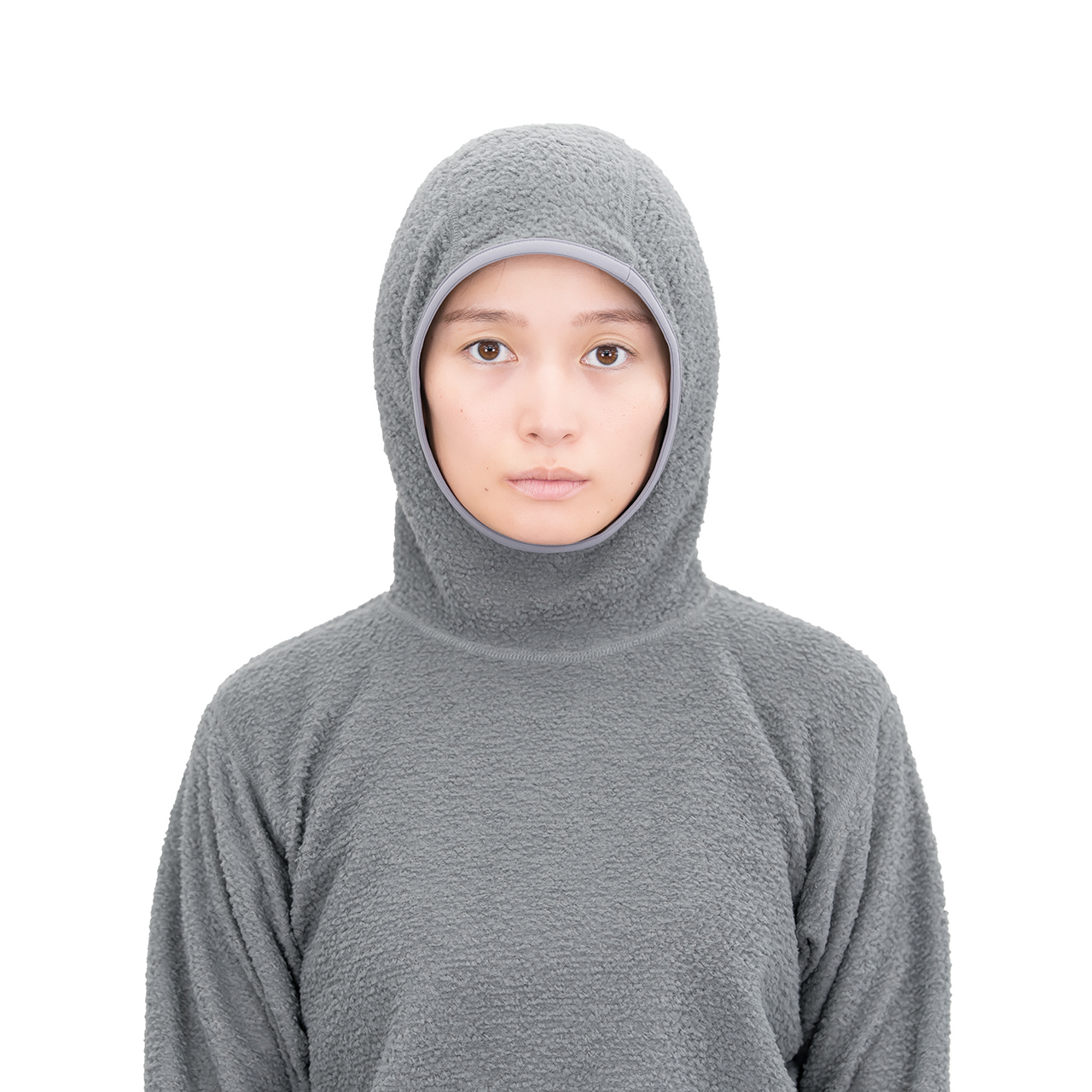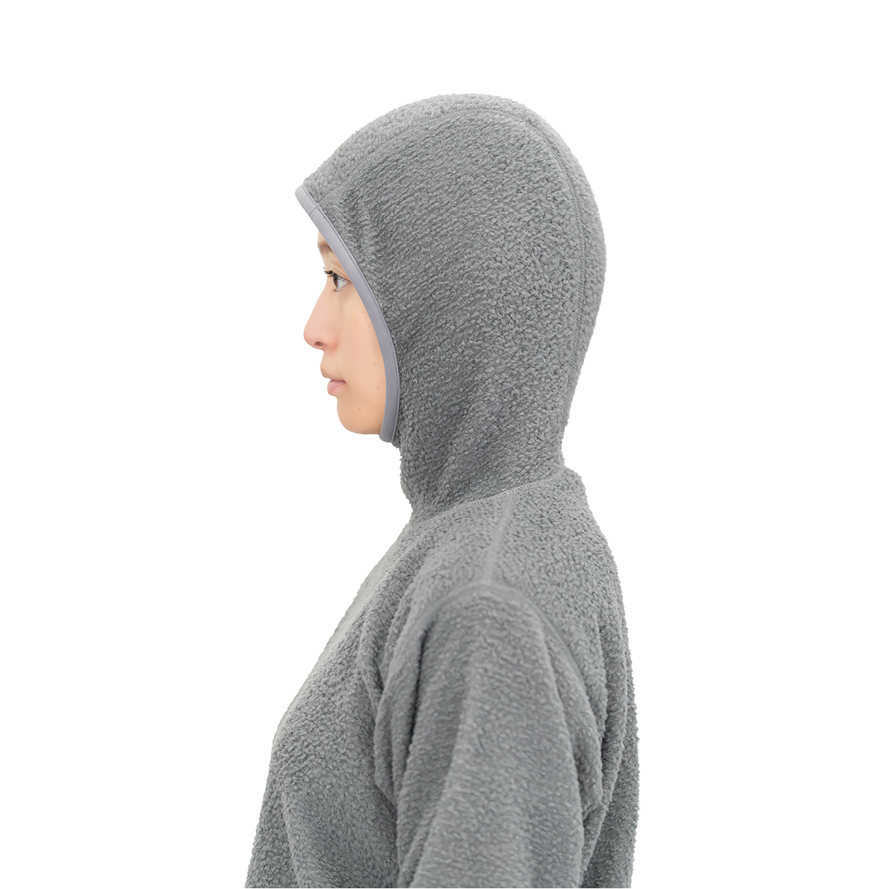 フード口は顎(あご)に引っ掛けて額(ひたい)がすこし出るくらいの大きさにデザインしています。